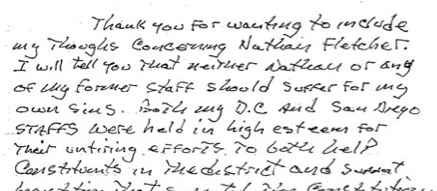 In the well-respected Voice of San Diego online journalism site, reporter Liam Dillon has managed to pen an entire story, Nathan And The Duke, about Fletcher and his time working for Cunningham. Cunningham wrote about Fletcher in a hand-written note to Dillon. For the story, Fletcher sat down for Dillon and made it very clear saying, “At the end of the day, I didn’t know anything, I didn’t do anything, I didn’t see anything. I didn’t have any connection or relationship to any of it.”