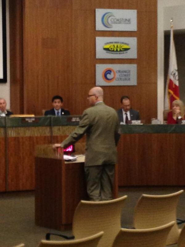 Huntington Beach Councilman Matt Harper speaks against the proposed Project Labor Agreement at the March 6, 2013 meeting of the Coast Community College District